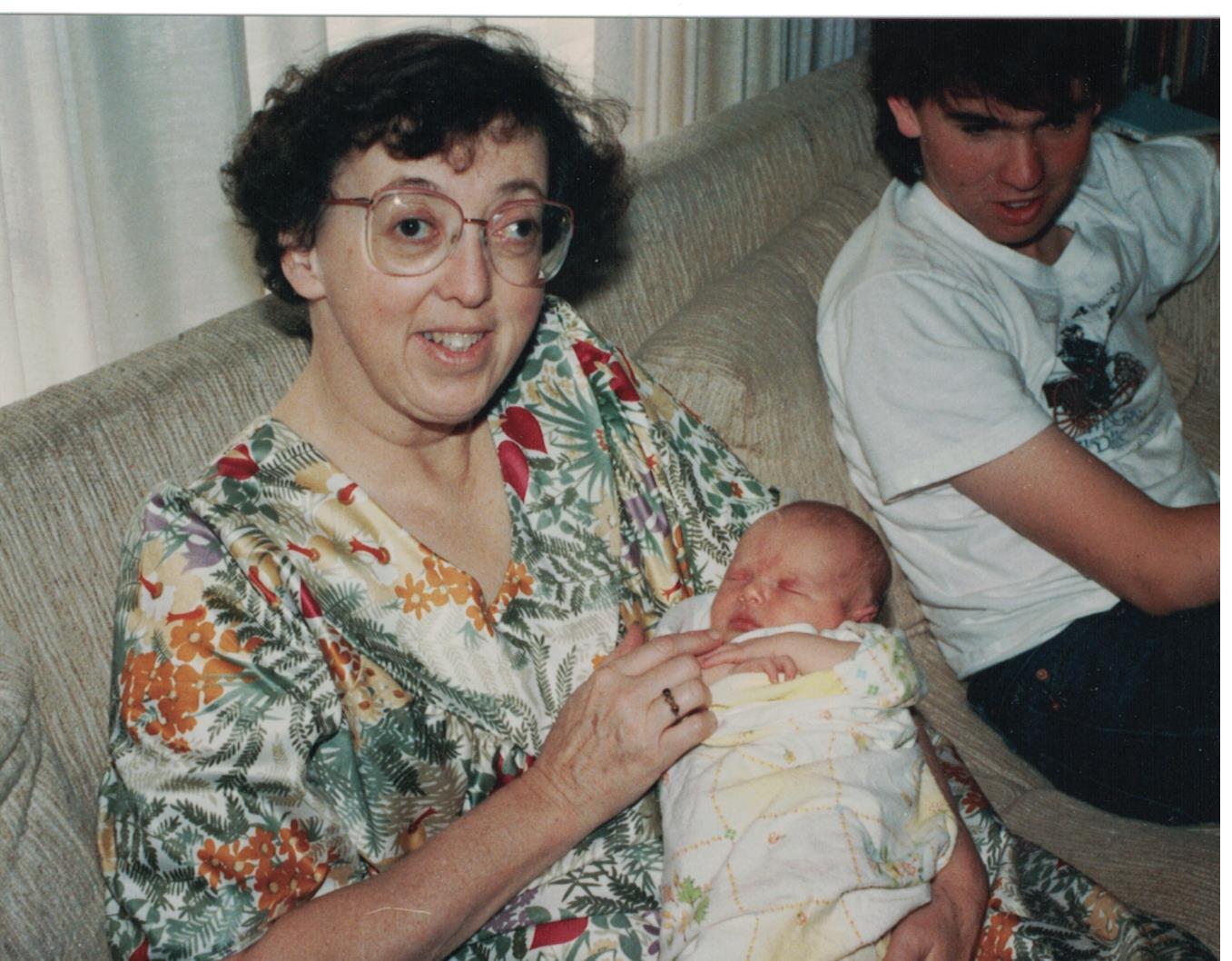 The purpose is to share photos and memories with my family in California and my grown children in the Midwest. Already my sisters have added comments and new photos to the story. Here’s one of my Aunt Sandy holding Grandbaby #1 (Susan) at my sister Sarah’s wedding. Aunt Sandy was not a grandmother yet, but obviously was enjoying the vicarious experience!
