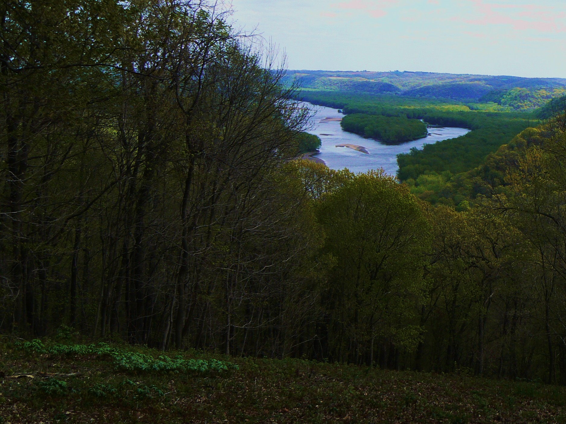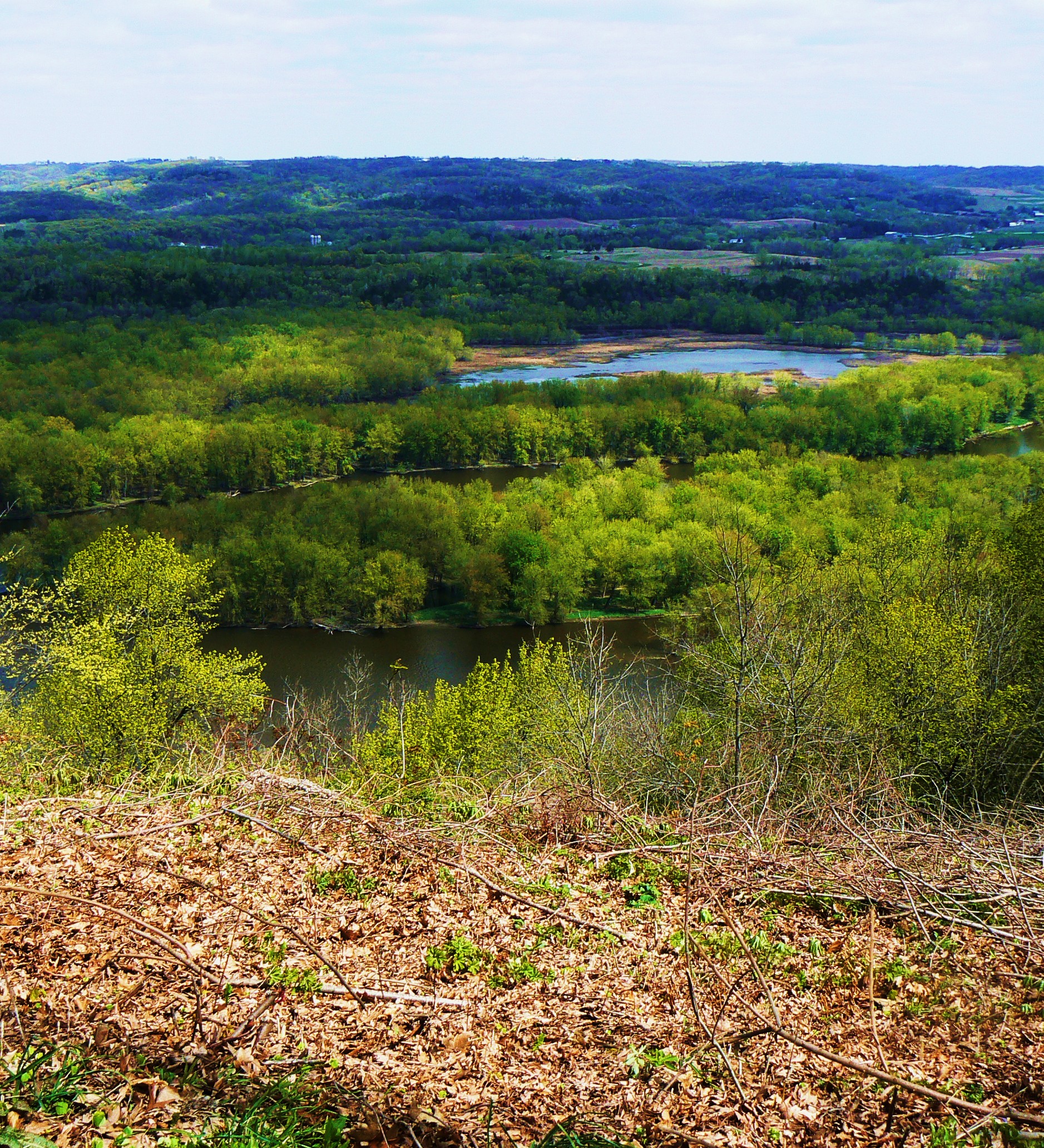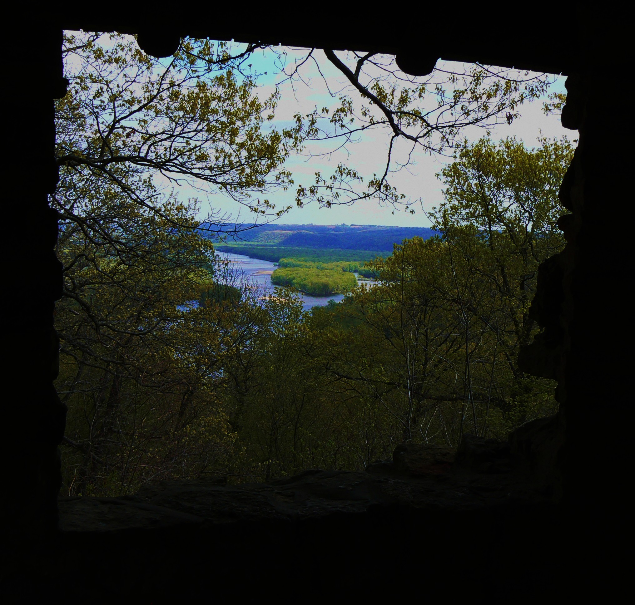 I have selected another batch of photos from our camping trip to Wyalusing and found a way to tie in the NaPoWriMo poetry challenge as well.  I promise I’ll get to spelunking and sunsets, but not today.  Today, it’s about the river….or rivers, as the Wisconsin and the Mississippi meet up.  Riparian zones (as scientists call the interface between river or stream and land) are great habitats for lots of diverse flora and fauna.  I told you about the wild turkeys in my last post.  More majestic in flight and about the same size, I found turkey vultures (or buzzards) and a bald eagle also enjoying all the area has to offer.  Bluff skimming, aerial gliding and diving, wind surfing…I think it would just be a blast to be one of the soaring carnivores.  You have to forgive me for not being equipped with the kind of camera equipment that can capture some of that flight.  Imagine instead that a swift shadow passes your peripheral vision, and you instinctively look upward, like any small mammal might.  Your gaze follows this heavenly creature until the last feather passes from view, and you realize you’ve forgotten to breathe.  They do that to me.  I don’t even think about trying to take a photo.   I also didn’t photograph the little field mouse we saw on the path we had just trekked a few minutes ago.  It wasn’t there the first time around.  It was obviously dead, but not marked or chewed.  My guess is that it was a fresh catch that got accidentally dropped from the height of flight and left for lost.  That picture stays in my mind only, out of respect.