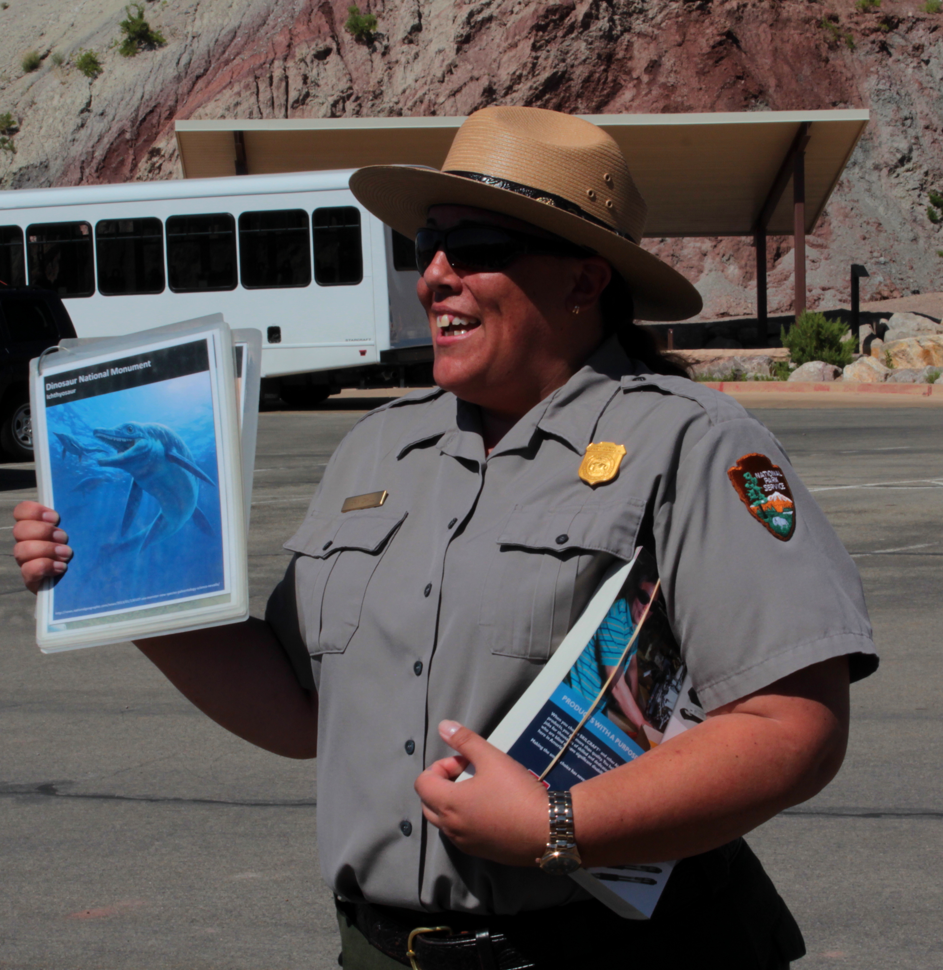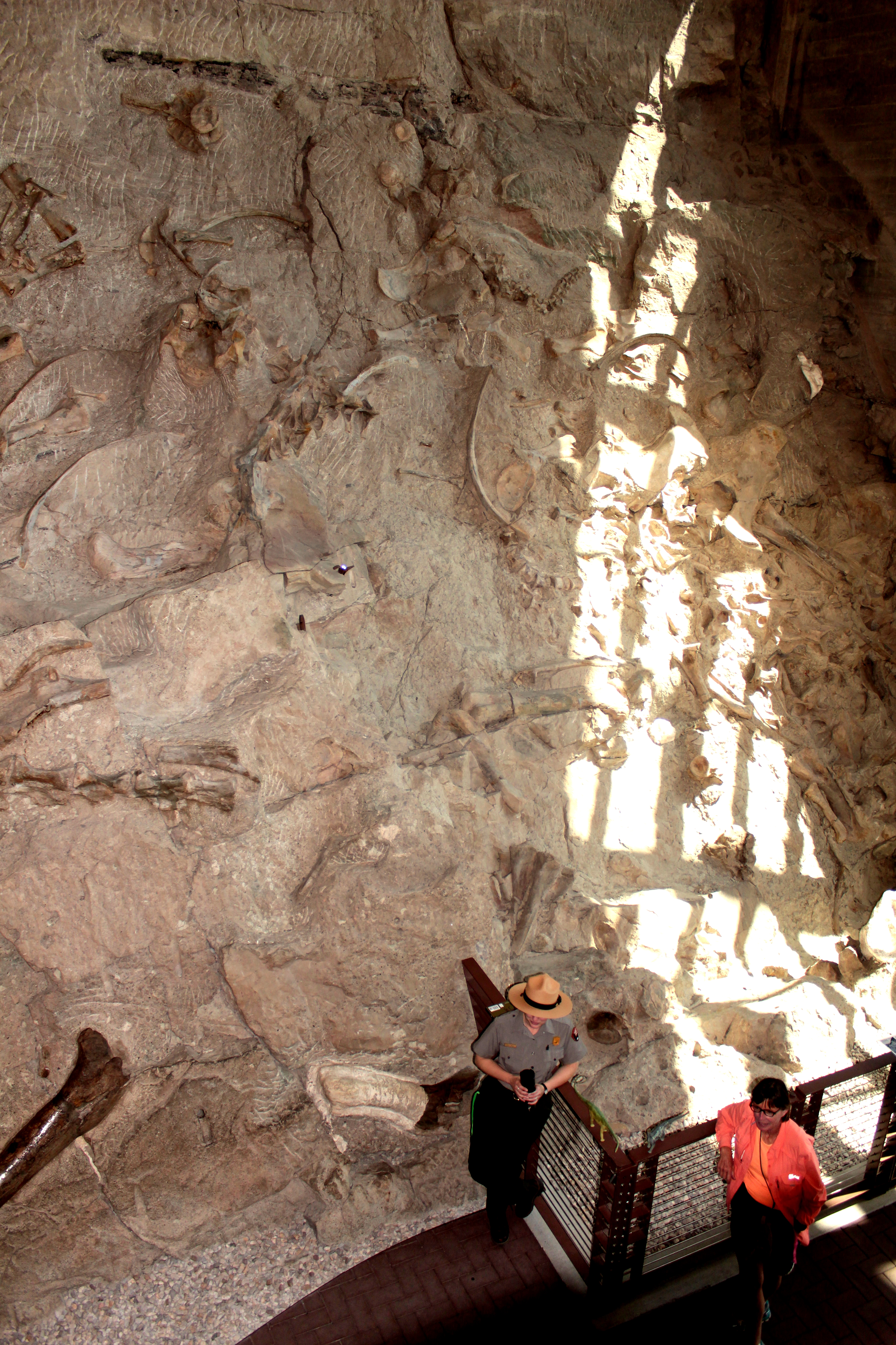 Picking a particular age is like selecting a product in a grocery aisle, according to Ranger Erin. And how did these layers become exposed like this? Ranger Erin demonstrated with a thick catalog of pages, striped horizontally on the edge. Pressure from the movement of the Rocky Mountains in the east and the Uinta Mountains in the west squeezed this section of Earth’s crust up into a kind of bell curve shape. Then the top was sliced off over time by the Green River. This provides unique access to layer upon layer of fossil history. It’s called the Morrison Formation.