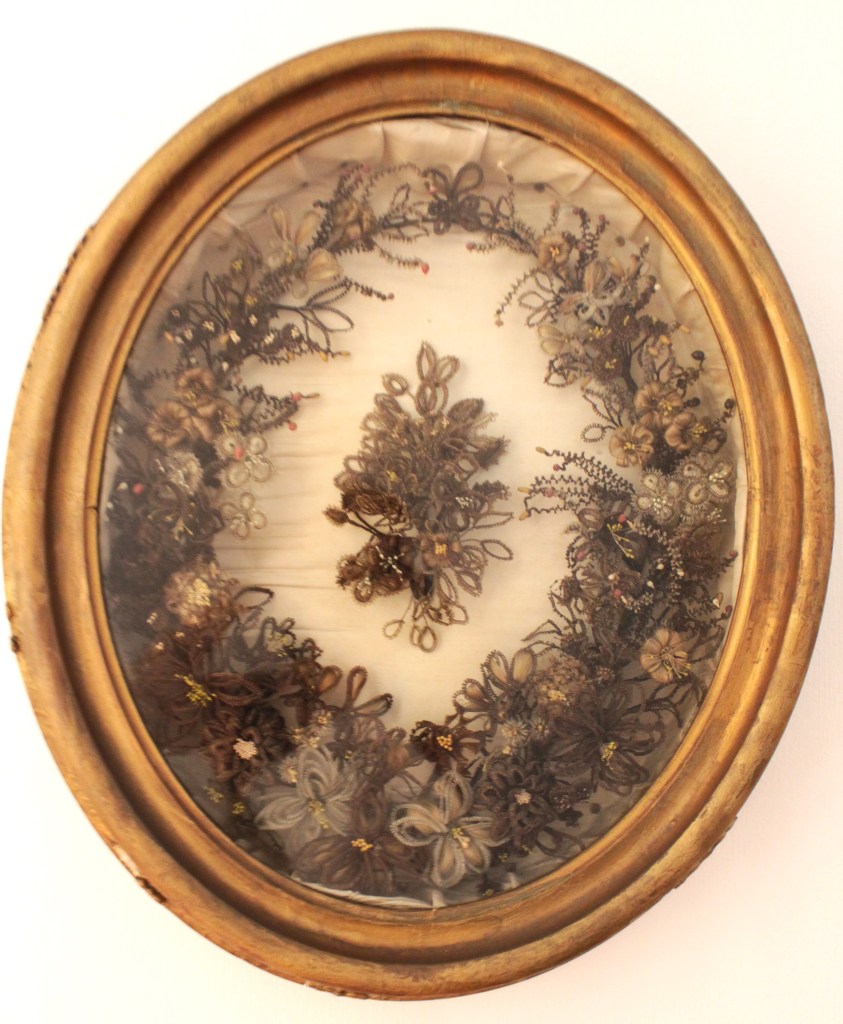 In the architecture of the old French Quarter, there are many historic buildings decorated with ornate iron work and hanging gardens. Inside one of the museums there hangs this Victorian hair wreath. Fine strands of human hair from beloved family members were braided and woven together to create this intriguing artifact.